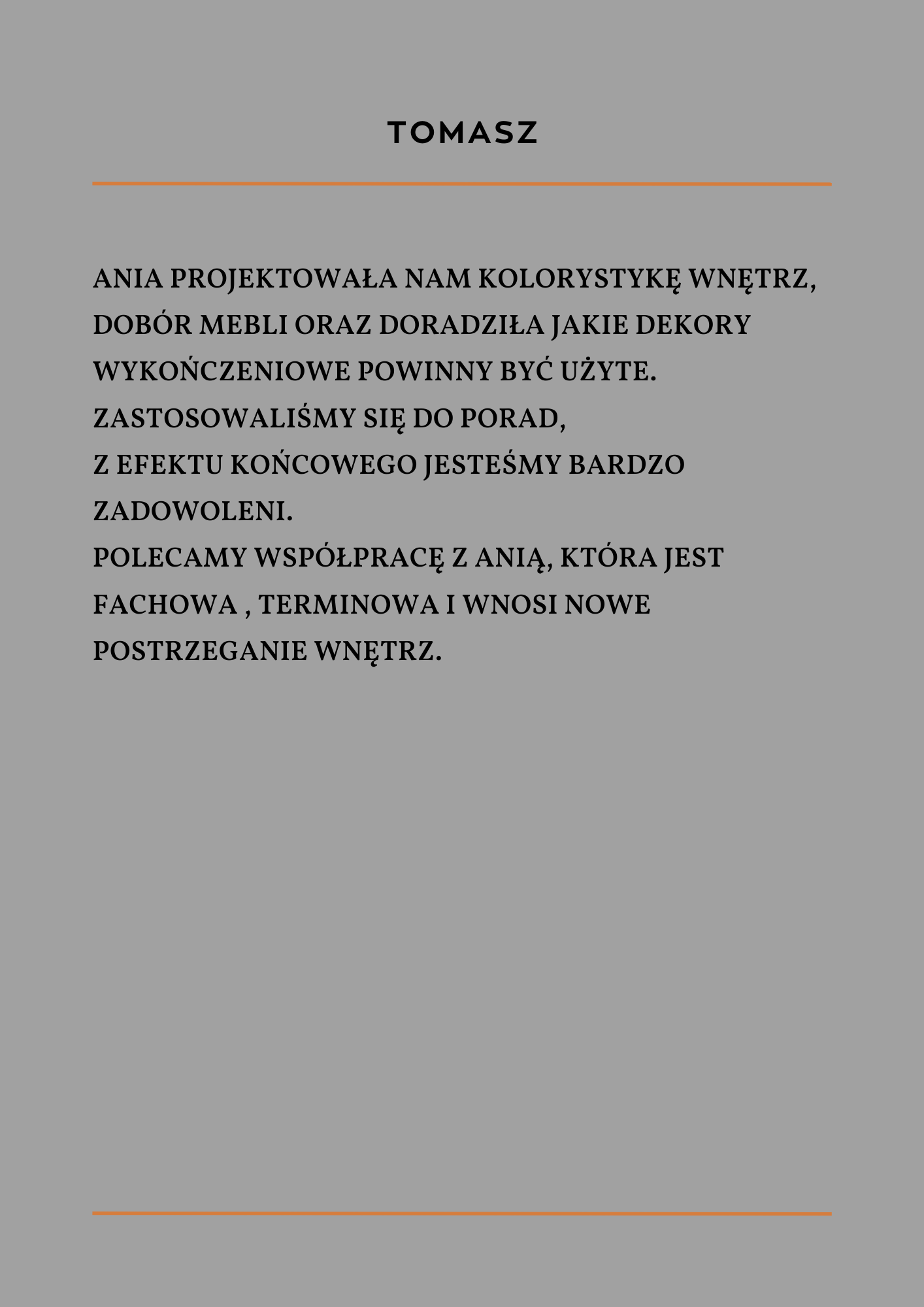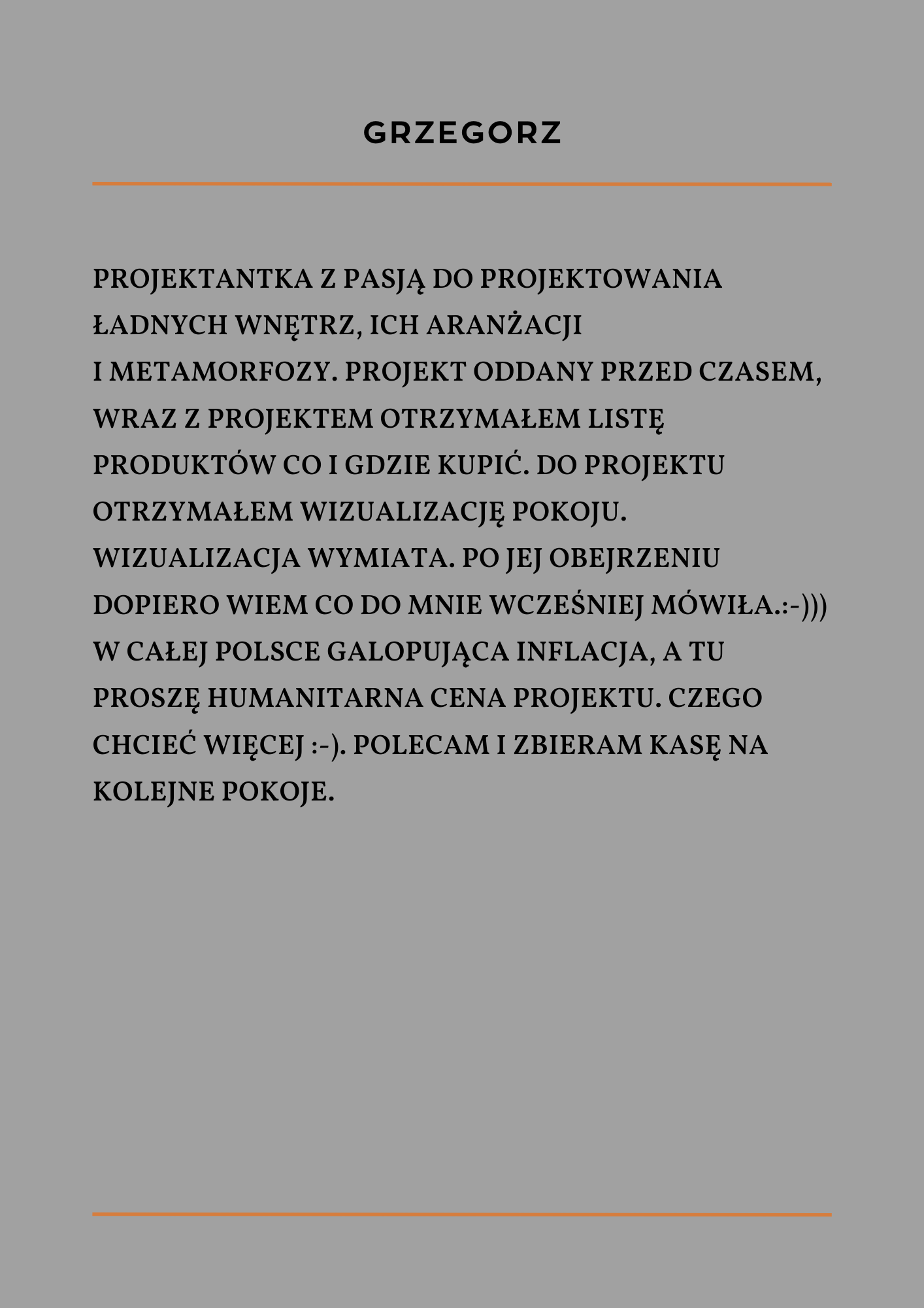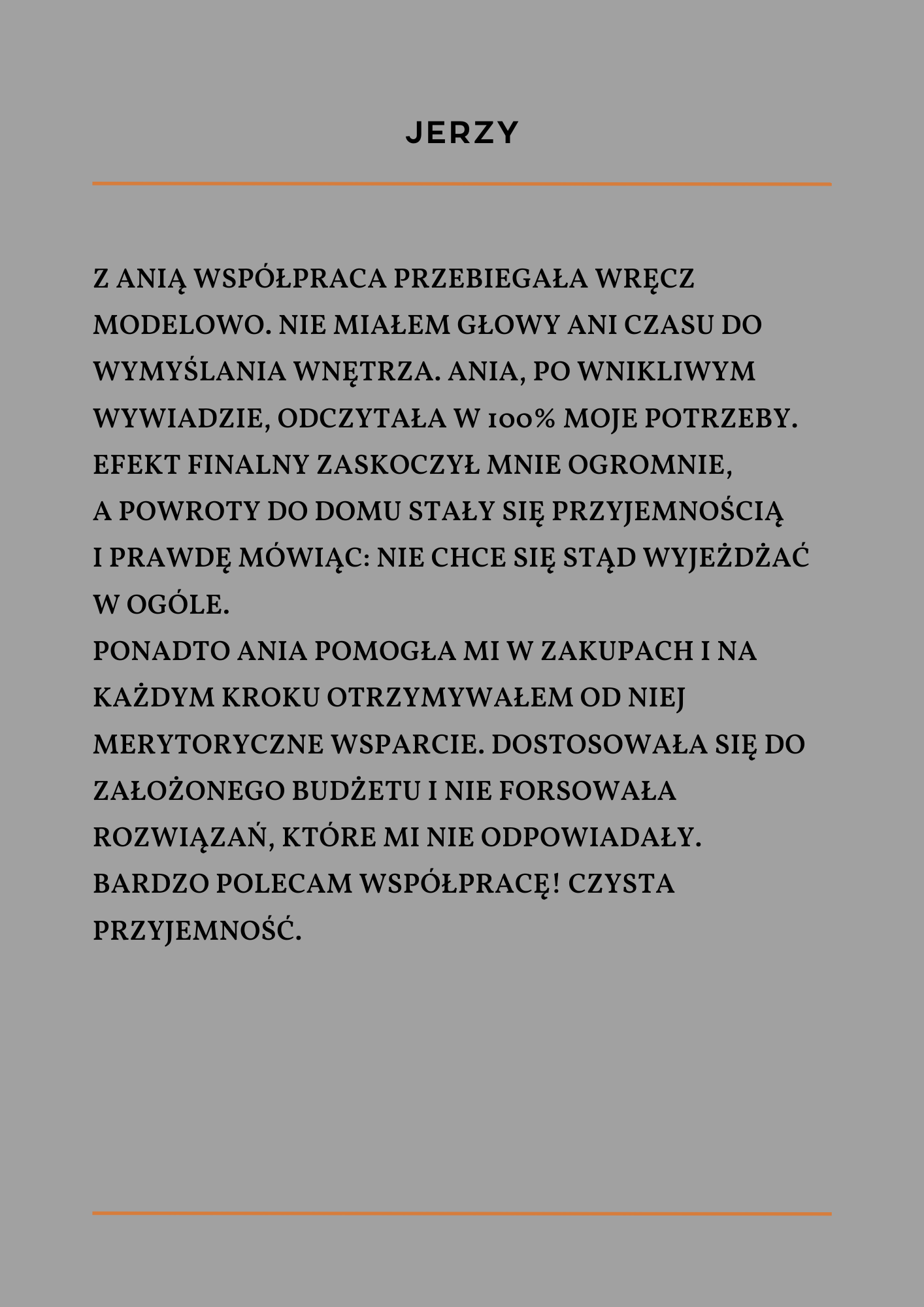 Co jeszcze? Znam realia otaczającego nas świata, zdaję sobie sprawę, że sam zakup nieruchomości jest sporym wydatkiem, a jej remont i urządzanie staje się kolejnym finansowym wyzwaniem. Jestem od tego, żeby Ci tę nierówną walkę pomóc wygrać. Pomogę Ci w podejmowaniu decyzji, podpowiem które rozwiązania są lepsze, a które gorsze, a jeśli nie masz pomysłu kompletnie na swoje wnętrze, to wręcz jest to sytuacja wymarzona dla mnie i takie zadania lubię najbardziej. I nie bój się - nie będę Ci wciskać stolika za 8.000 zł, bo też uważam, że to chore wydawać takie pieniądze na drobne wyposażenie. chyba, że będzie to Twoim życzeniem, to też wiem gdzie szukać.