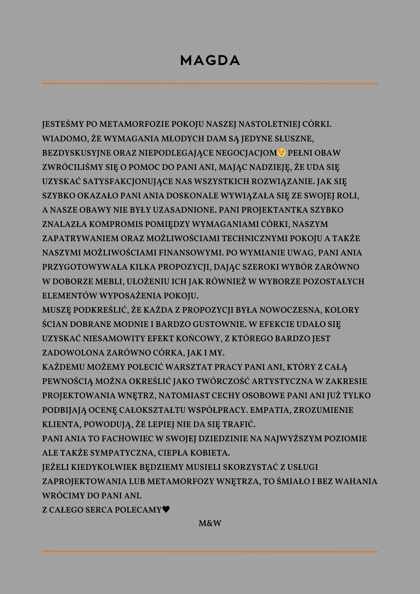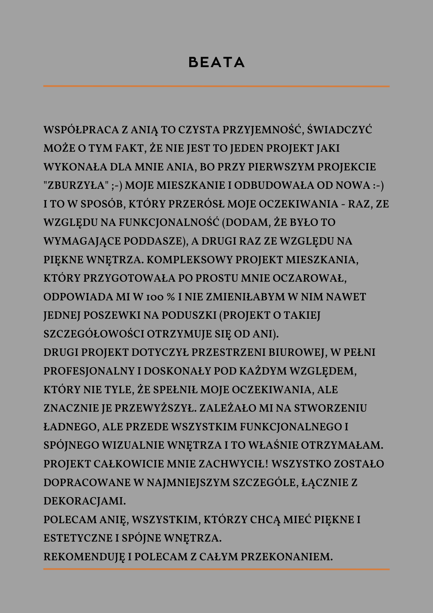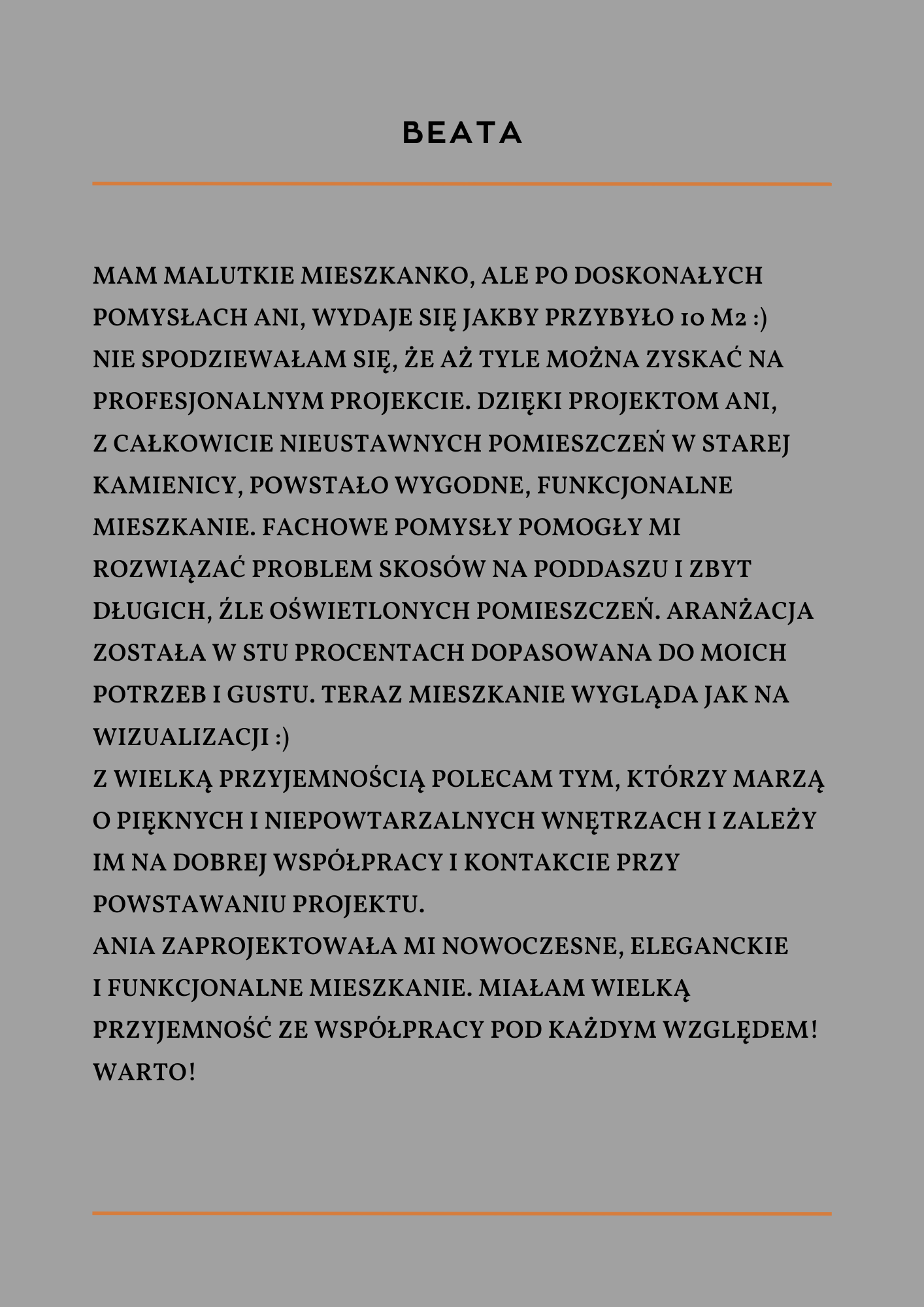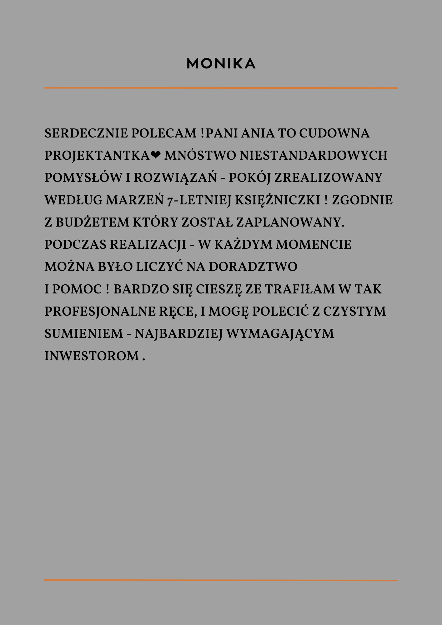 Co jeszcze? Znam realia otaczającego nas świata, zdaję sobie sprawę, że sam zakup nieruchomości jest sporym wydatkiem, a jej remont i urządzanie staje się kolejnym finansowym wyzwaniem. Jestem od tego, żeby Ci tę nierówną walkę pomóc wygrać. Pomogę Ci w podejmowaniu decyzji, podpowiem które rozwiązania są lepsze, a które gorsze, a jeśli nie masz pomysłu kompletnie na swoje wnętrze, to wręcz jest to sytuacja wymarzona dla mnie i takie zadania lubię najbardziej. I nie bój się - nie będę Ci wciskać stolika za 8.000 zł, bo też uważam, że to chore wydawać takie pieniądze na drobne wyposażenie. chyba, że będzie to Twoim życzeniem, to też wiem gdzie szukać.